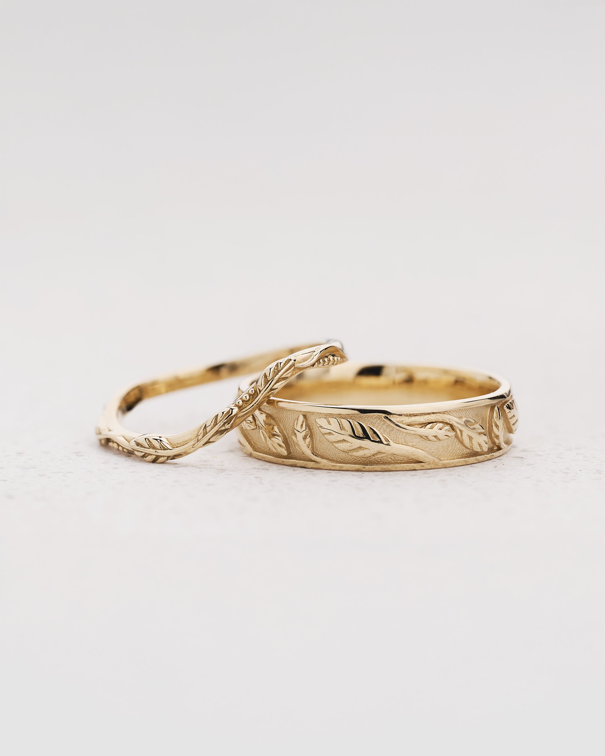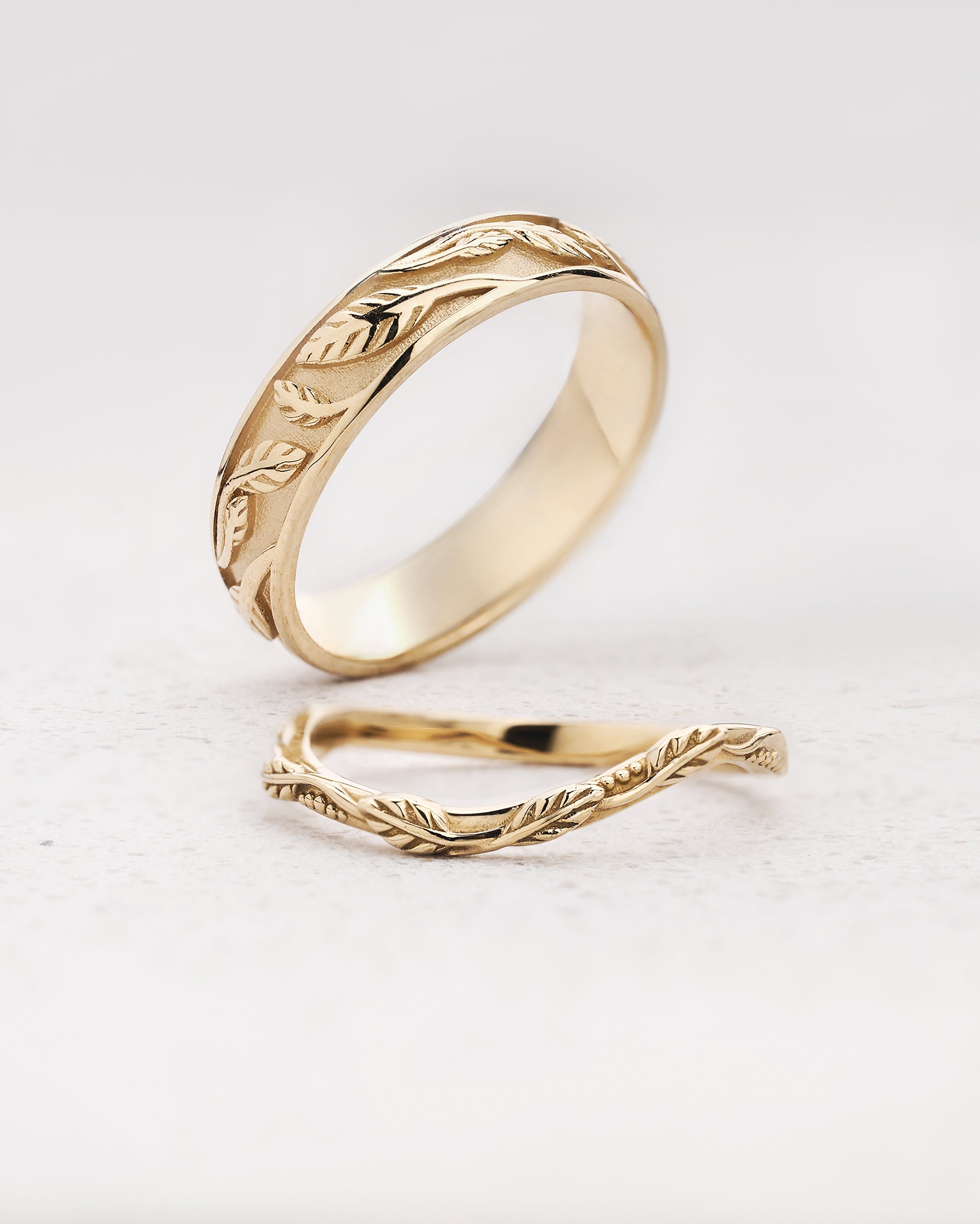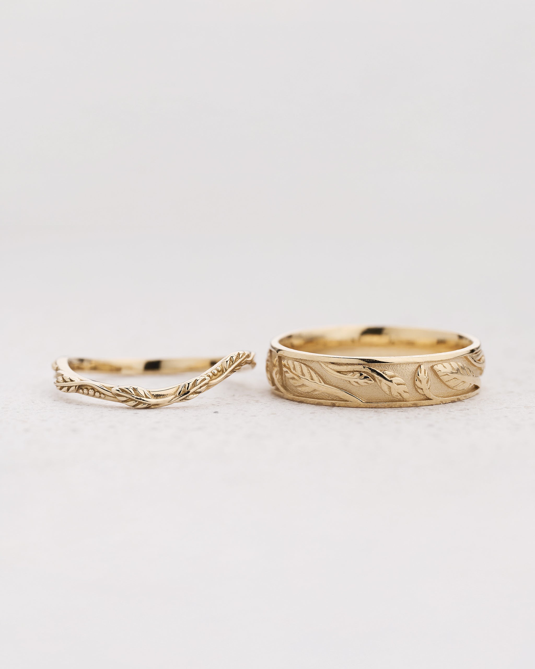This nature set for couples includes one curved wedding band and one wedding band with a carved leaves pattern - original yet classic, it will be a great choice for people who look for a comfortable ring to wear every day.