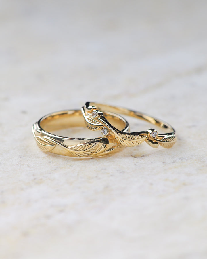 Golden leaves wedding bands set for a couple / Azalea - Eden Garden Jewelry™