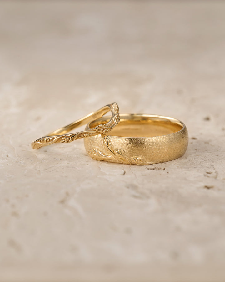 Wedding rings set for couples: sanblast finish band with branch for him, simple curved twig ring for her