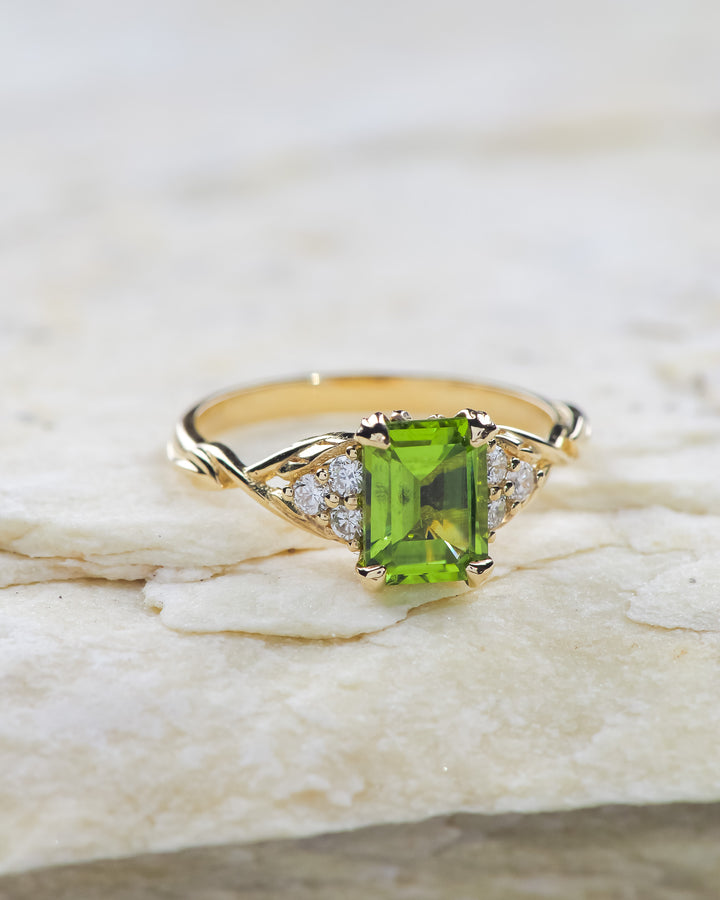 READY TO SHIP: Gloria ring in 14K yellow gold, natural peridot 8x6 mm, accent lab diamonds, AVAILABLE RING SIZES: 5.5 - 8.5 US - Eden Garden Jewelry™