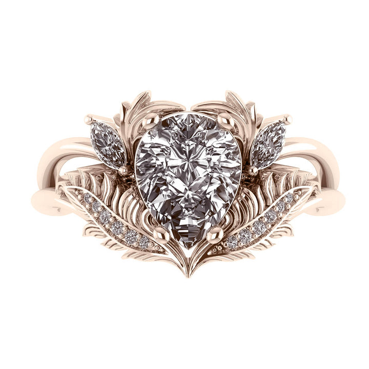 Adonis engagement ring style features author's design inspired by nature. Ring is adorned with big pear cut gemstone surrounded by leaves and two marquise cut gemstones. Feathered leaves lined with pave setting diamonds are highly detailed and show the best quality of fine jewelry work.