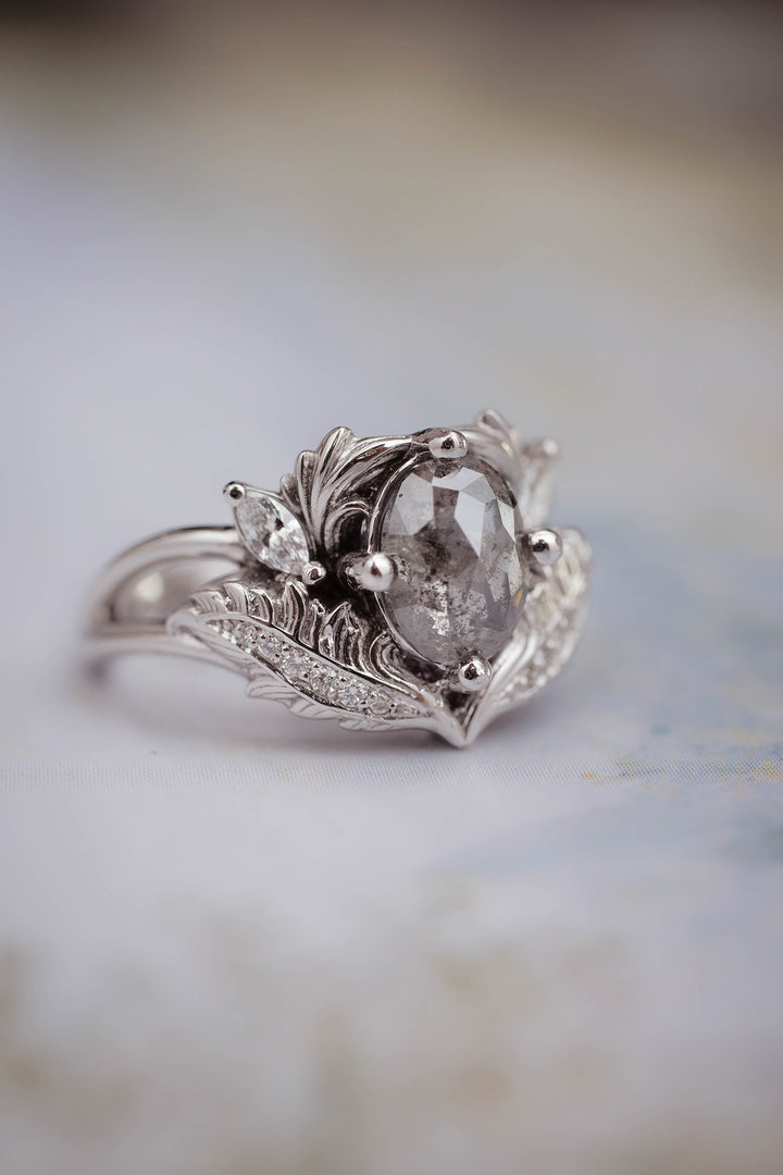 This unique engagement ring features author's design inspired by nature. Solid gold ring is adorned with natural salt & pepper diamond, accent stones: marquise cut and round cut diamonds. You can choose accents as natural diamonds or lab grown diamonds in option. Leaves are highly detailed and features best quality of fine jewelry work.
