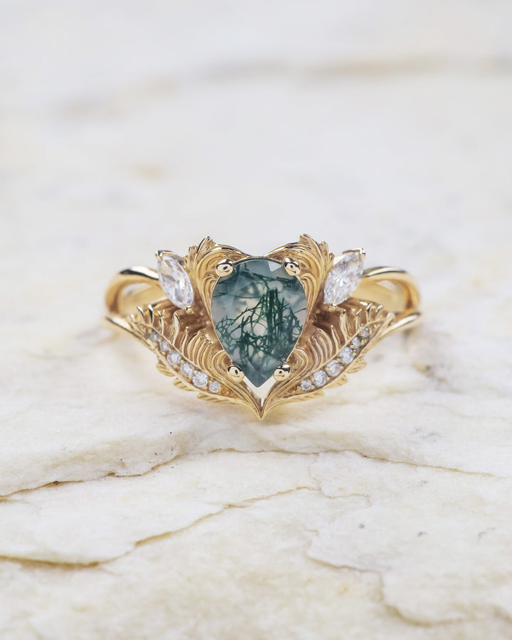 READY TO SHIP: Adonis ring in 14K or 18K yellow gold, pear cut moss agate, accent lab grown diamonds, RING SIZES: 6 - 9.5 US - Eden Garden Jewelry™