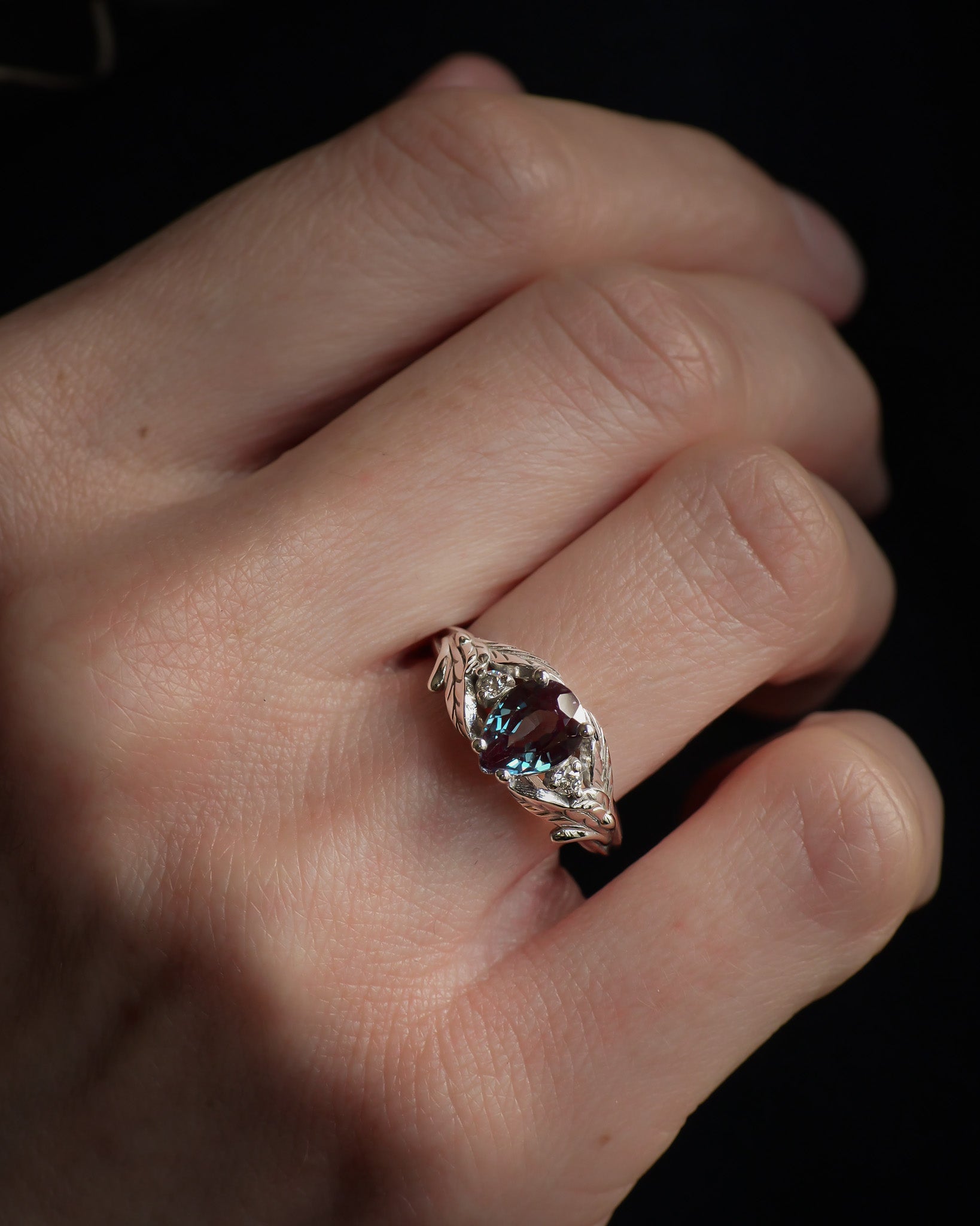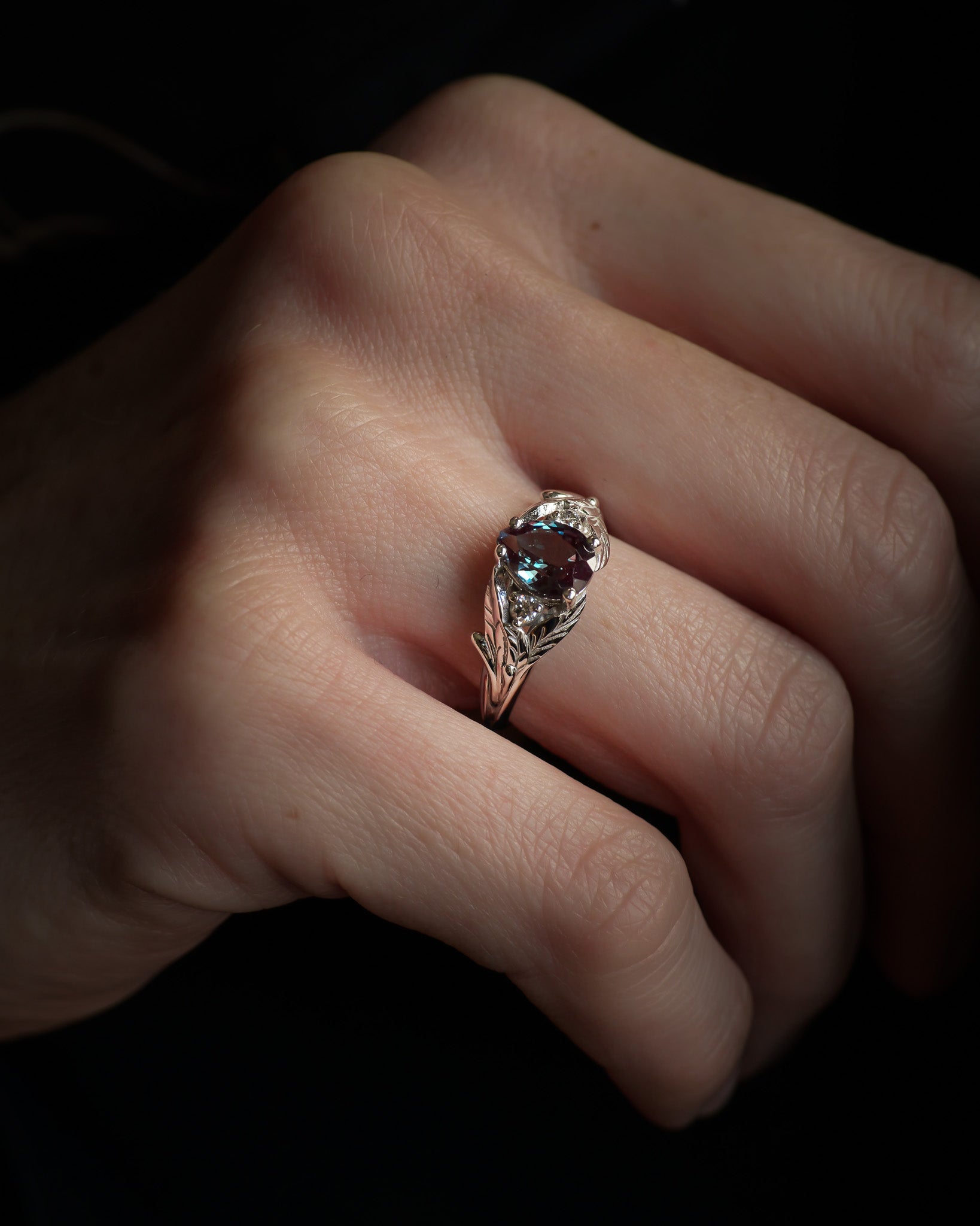This Wisteria engagement ring features lab alexandrite which is truly magical - it changes colours depending on a lighting. Unique proposal ring is adorned with two accent diamonds that can be natural or lab-grown.