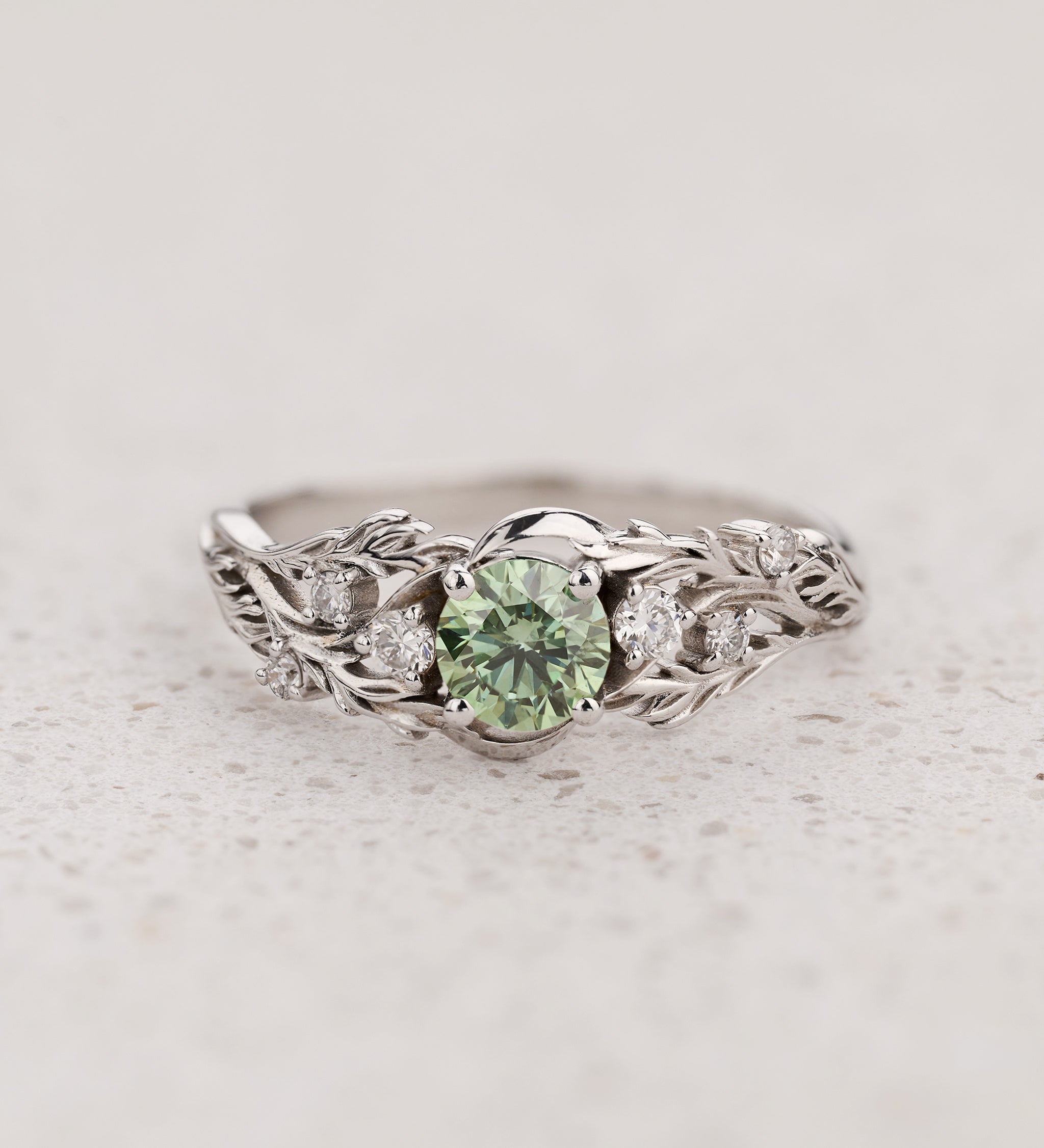 READY TO SHIP: Japanese Maple ring with round lab-grown green diamond, 14K white gold, AVAILABLE RING SIZES: 5.5 - 8.5 US