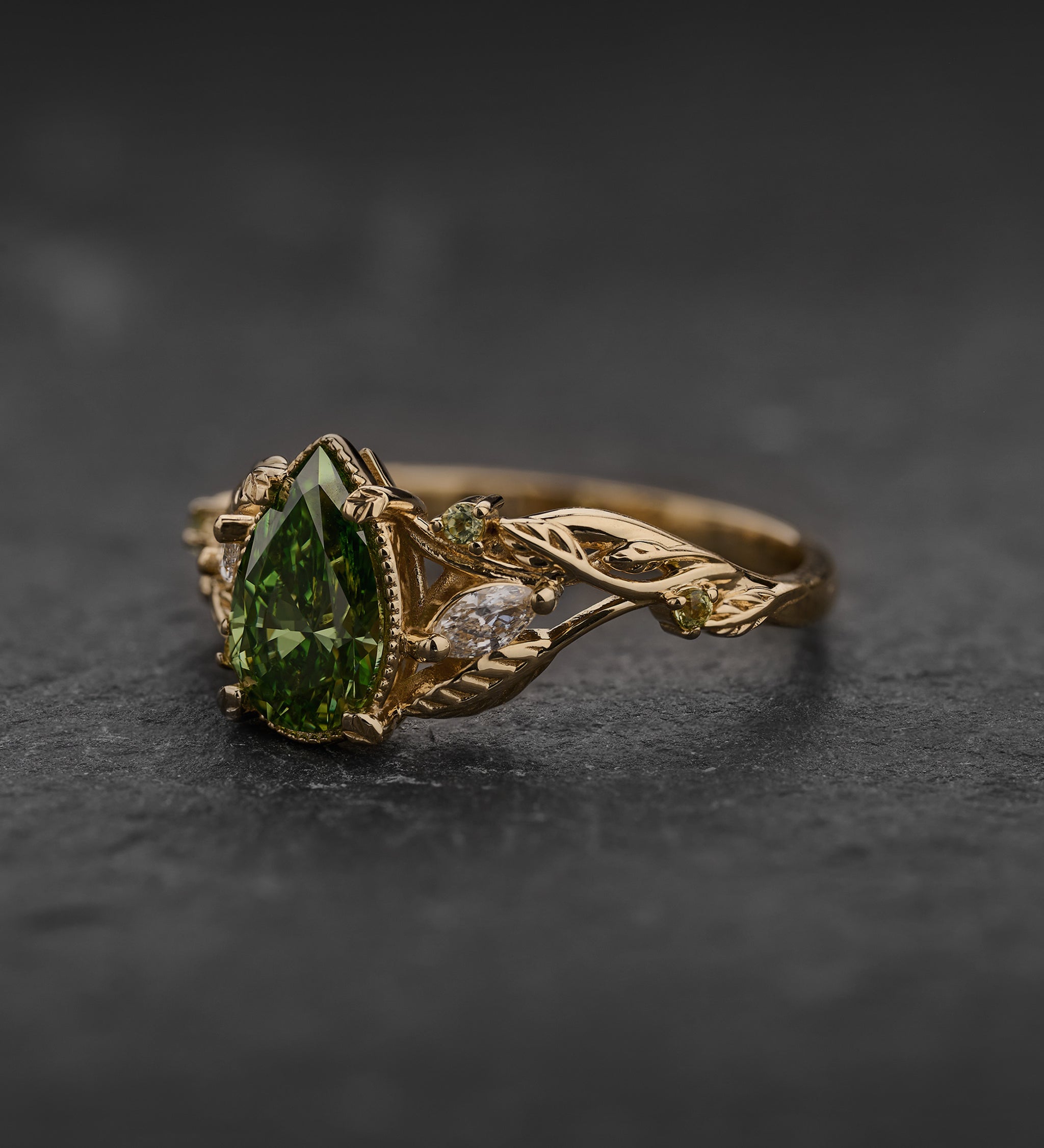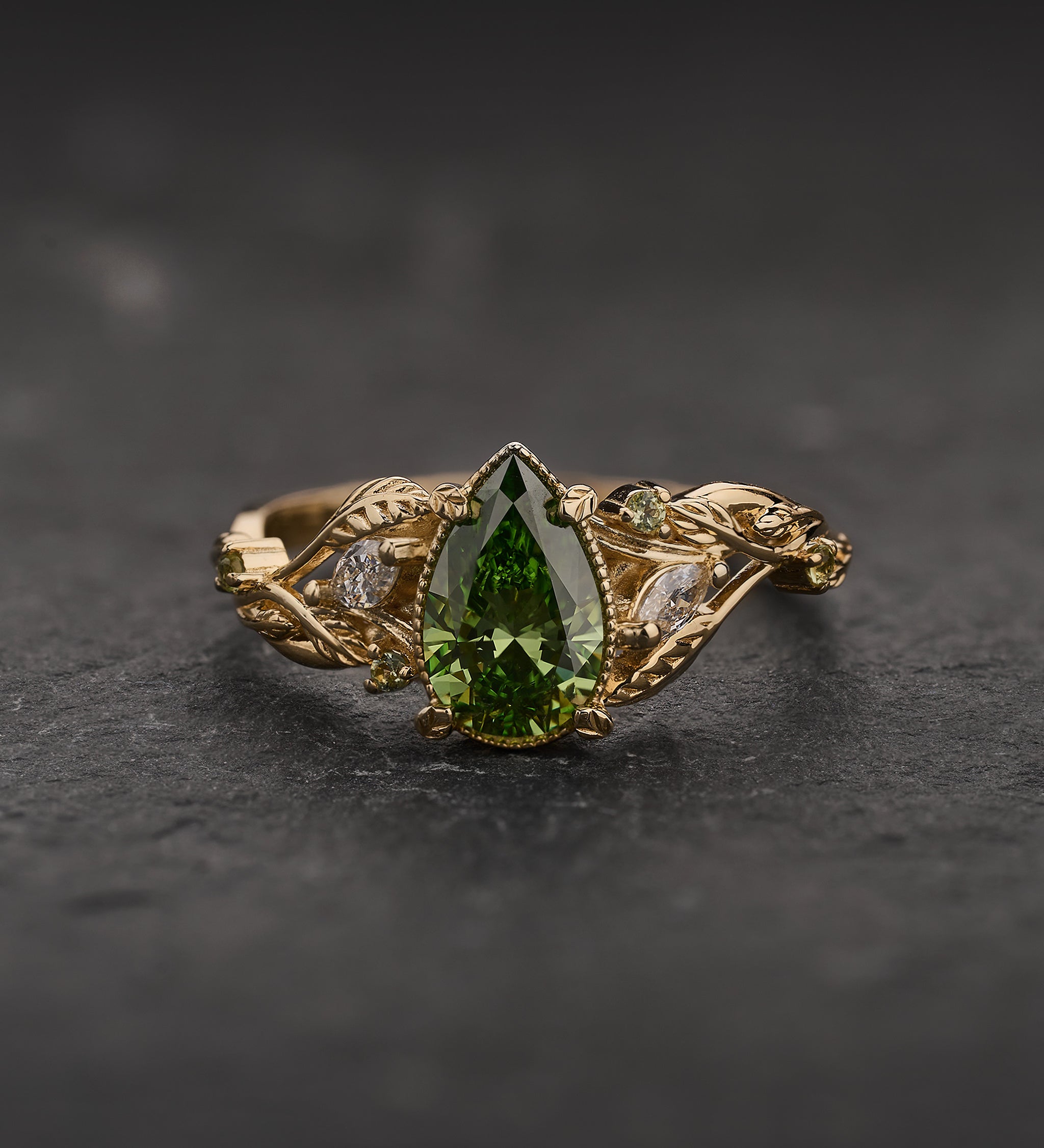 READY TO SHIP: Patricia ring in 14K yellow gold, lab-grown diamond, pear cut 8x6 mm, accent lab diamonds & tsavorite garnets, AVAILABLE RING SIZES: 5.5 - 8.5 US