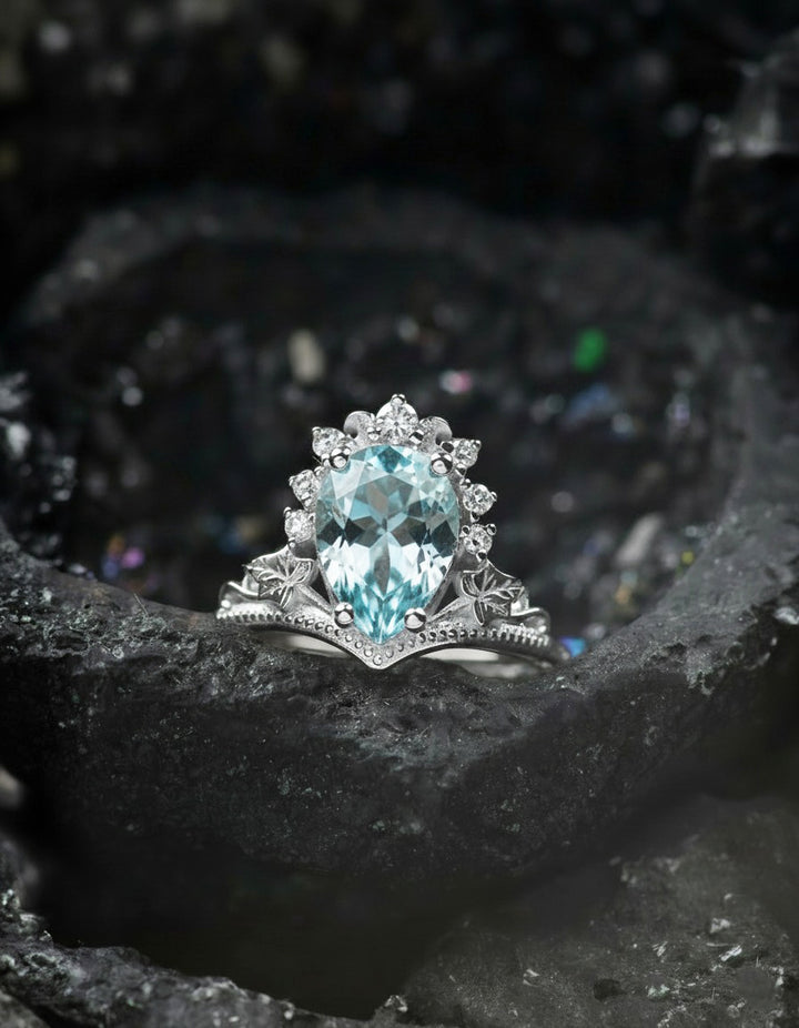 Magnificent engagement ring features nature inspired style with tiny ivy leaves and the most delicate details you can imagine. This version comes with big pear cut gemstone -aquamarine. It will be a great choice for those looking for untraditional yet elegant and timeless engagement ring.