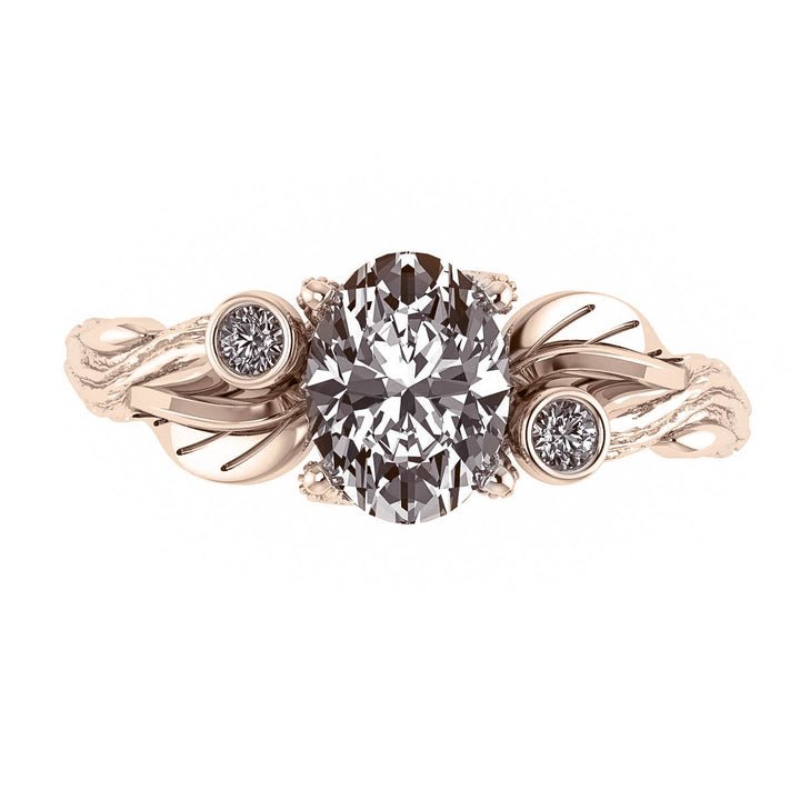 Like a real tree branch our Arius ring shows detailed wood texture and natural leaf movements. Interlacing twigs are holding central gemstone complimented with sparkling accent stones. Bridal set contains matching wedding band - a lovely leaf wreath with curved shank for a comfortable fit.