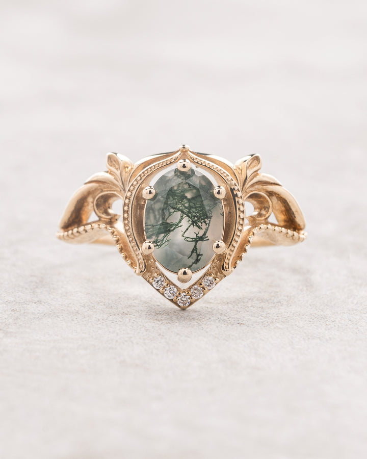 READY TO SHIP: Lida engagement ring with oval moss agate, 14K yellow gold, AVAILABLE RING SIZES: 4.75 - 7.75 US