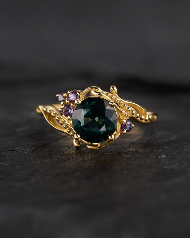 READY TO SHIP: Undina asymmetric engagement ring with natural teal sapphire and alexandrites, 14K yellow gold, RING SIZES: 5.5 - 8.5 US