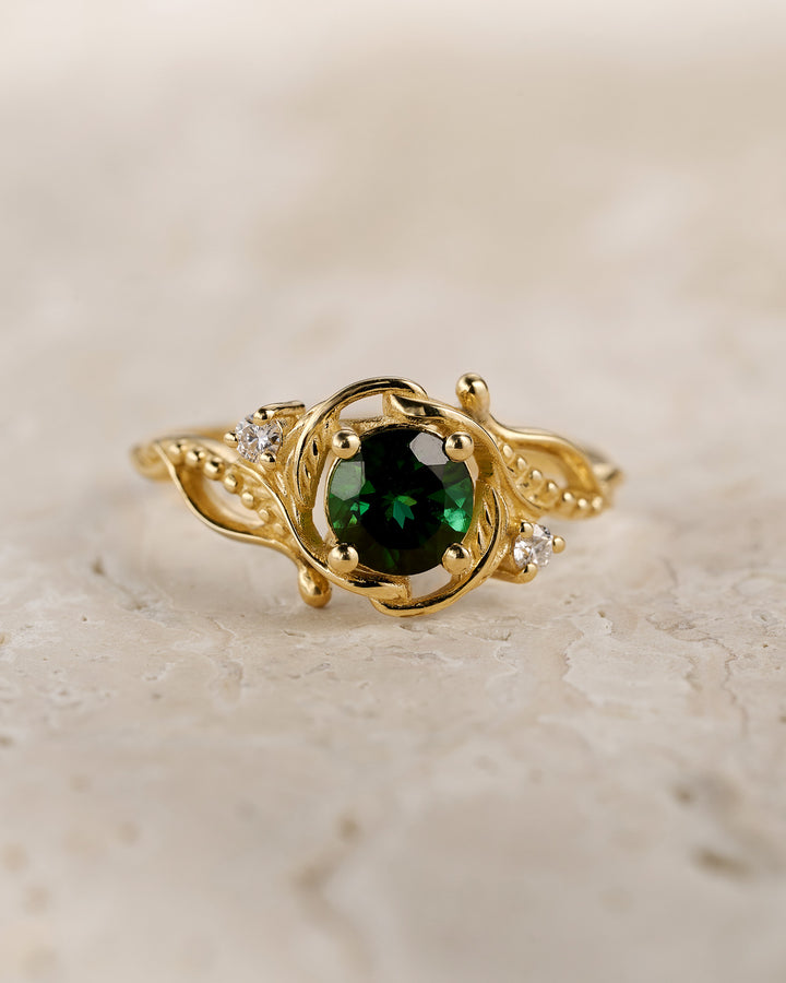 READY TO SHIP: Undina engagement ring with natural green tourmaline and diamonds, 14K yellow gold, RING SIZES: 5.5 - 8.5 US - Eden Garden Jewelry™