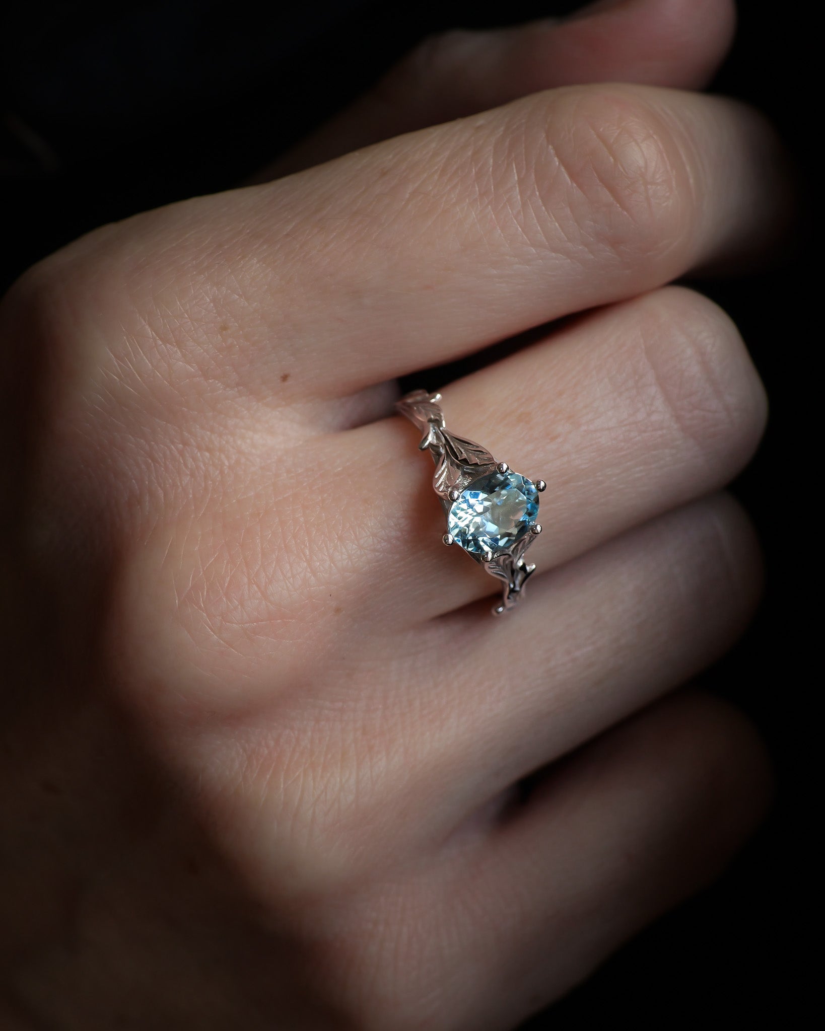It's all about harmony and romance. Freesia ring will represent your tender feelings and serious intentions in the best way. Handcrafted from solid gold or platinum, this engagement ring features detailed leaves and organic lines wrapped around the central gemstone.