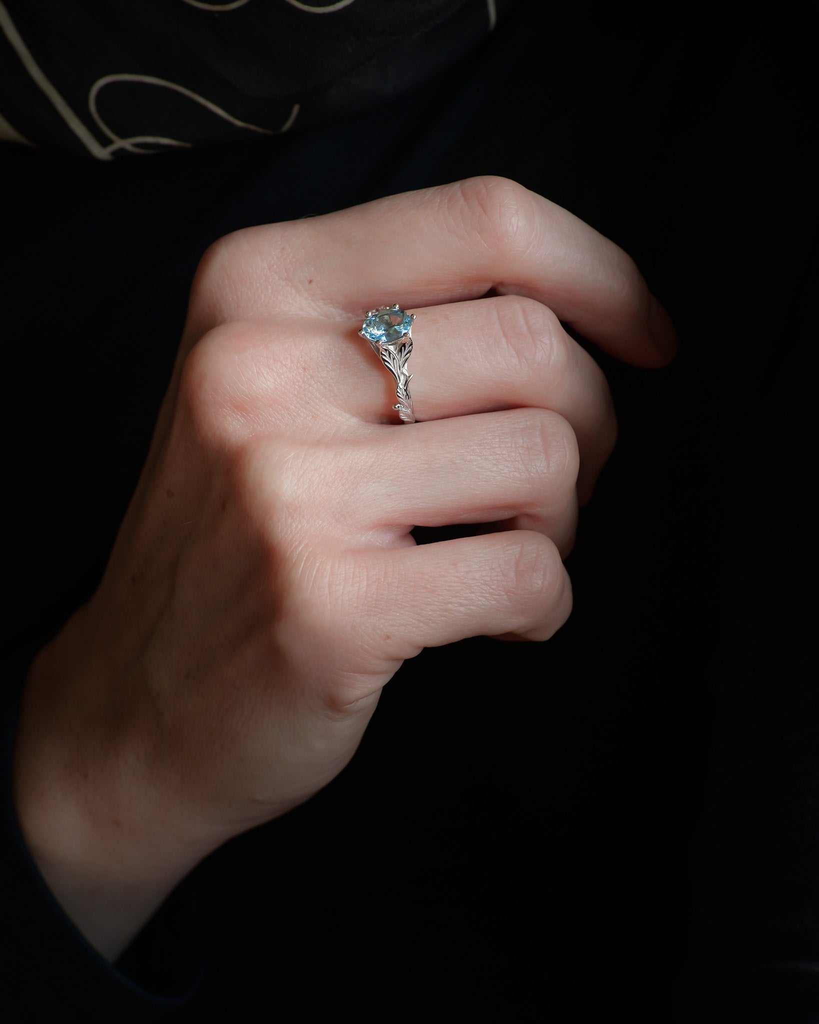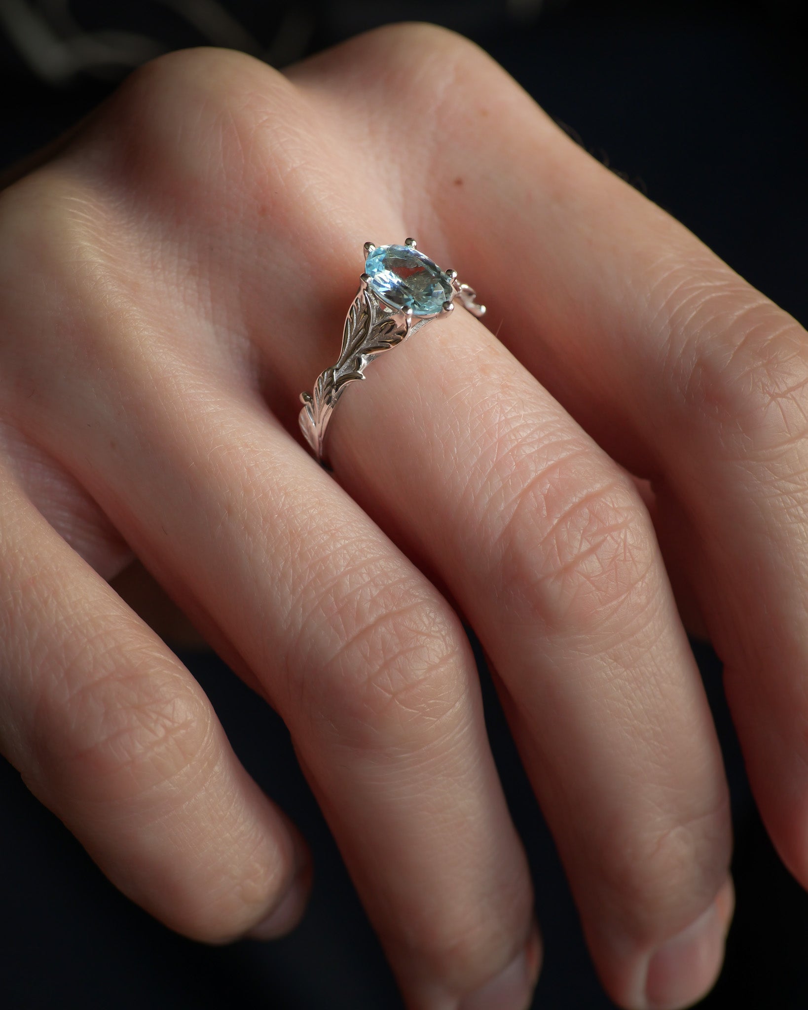 It's all about harmony and romance. Freesia ring will represent your tender feelings and serious intentions in the best way. Handcrafted from white gold, this engagement ring features detailed leaves and organic lines wrapped around the central gemstone.