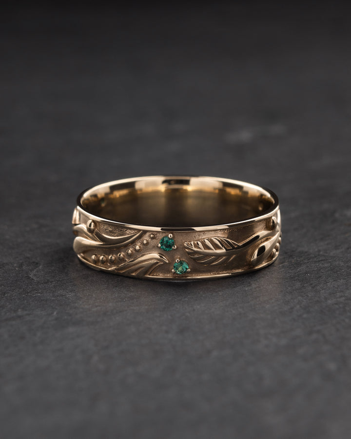 If you've chosen Callisto engagement ring for her, this ring could be an option for man's wedding band. It features matching leaf design with carved elements all around the band. This version has lab emerald gemstones, but is available with other gemstones or without any as well.