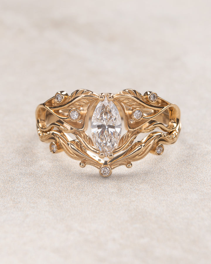 Callisto name came from Greek and means "most beautiful". This art nouveau inspired engagement ring is truly one of the most exquisite from our collection. It features central marquise cut gemstone surrounded by sparkling diamond halo and hold by skilfully make leaves composition.