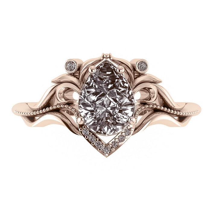 The vintage-inspired Lida engagement ring features sophisticated style and a timeless look. Art nouveau stylized flowers wrap around central pear cut gemstone and accent stones add charming sparkle. Magnificent proposal ring shows the highest quality fine jewelry craftsmanship you can imagine. We're proud of this design: its balanced composition, delicate yet sturdy details make the ring perfect for everyday wear and years to come.