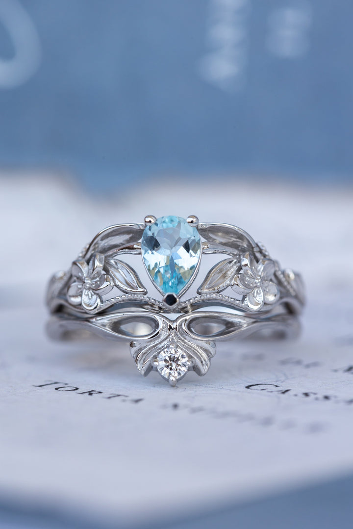Natural aquamarine engagement ring set, art nouveau flower bridal ring set