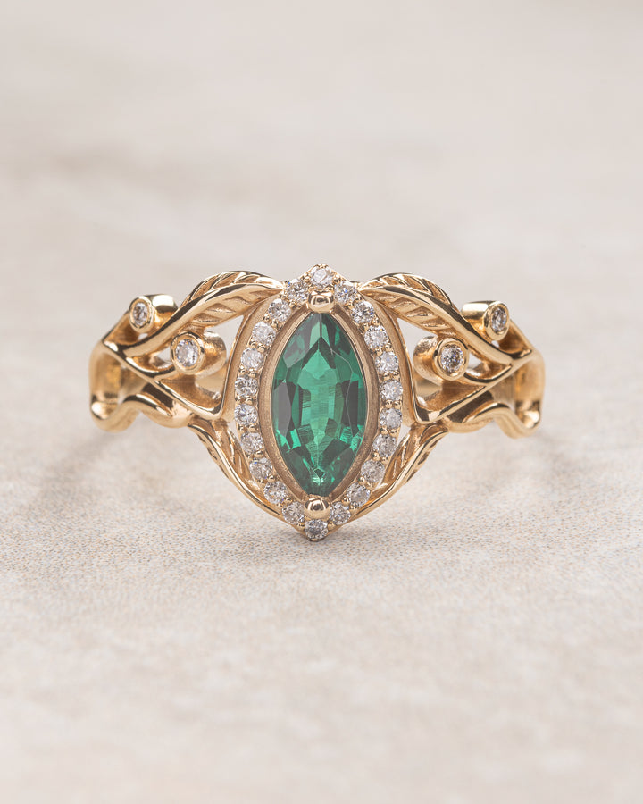 Marquise engagement ring with lab emerald and diamond halo / Callisto - Eden Garden Jewelry™