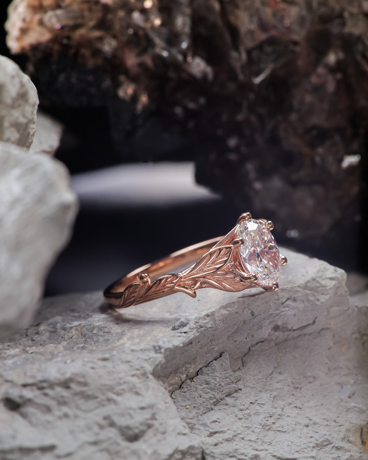 Lab grown diamond leaf engagement ring, oval cut gemstone proposal ring