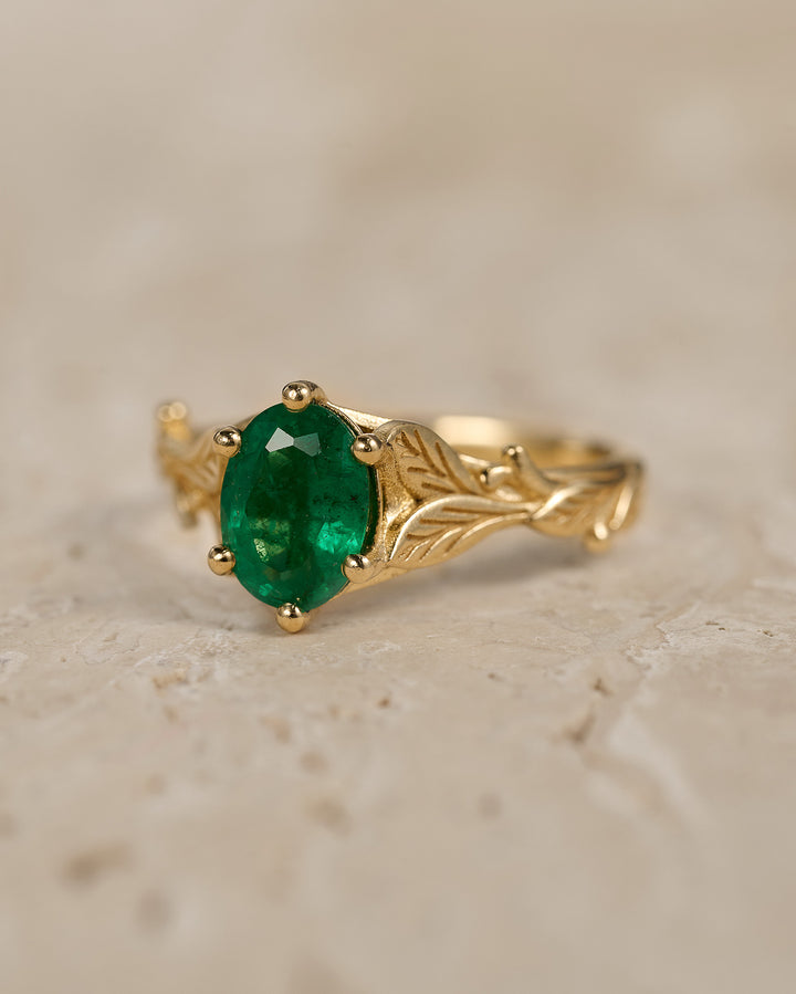 Natural emerald engagement ring, gold nature inspired engagement ring