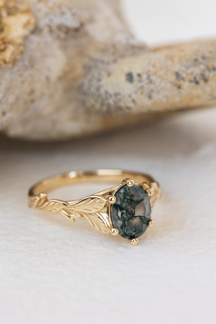 Natural moss agate gold leaf engagement ring, delicately sculpted proposal ring