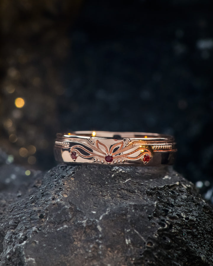 READY TO SHIP: Nature themed wedding band in 14K rose gold with accent garnets, RING SIZE 9 US