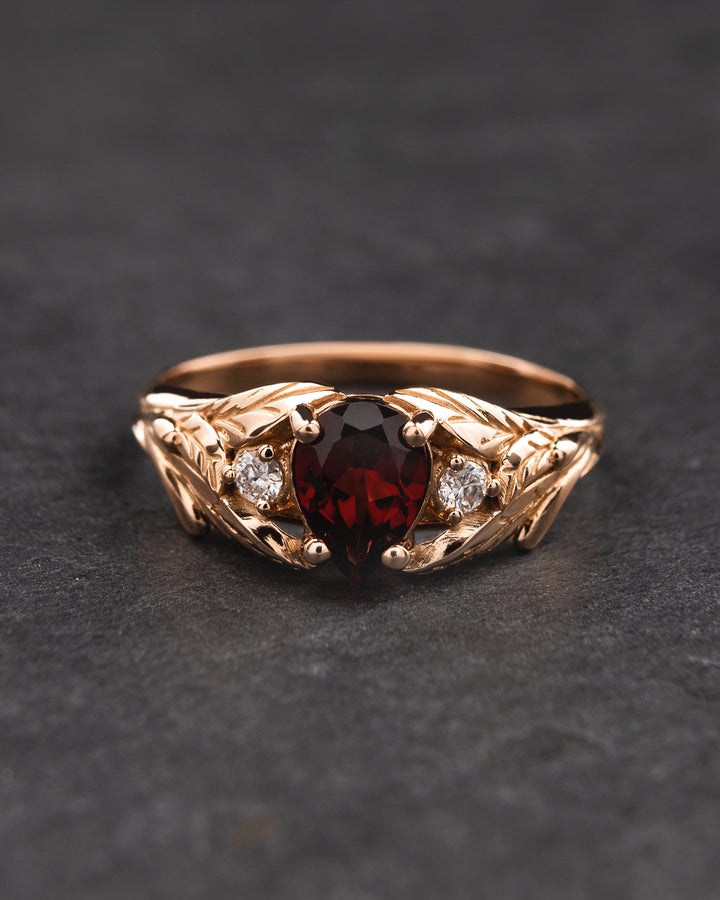 This Wisteria engagement ring features pear cut garnet. Unique proposal ring is adorned with two accent diamonds.