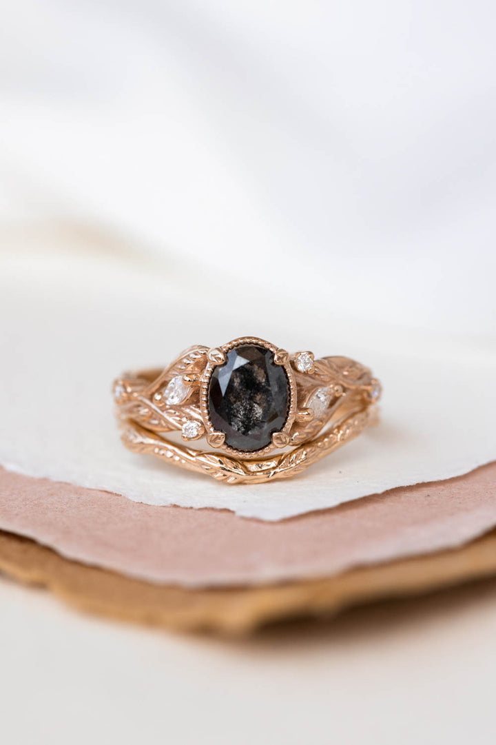 Oval salt and pepper diamond engagement ring set, nature inspired bridal ring set with diamonds