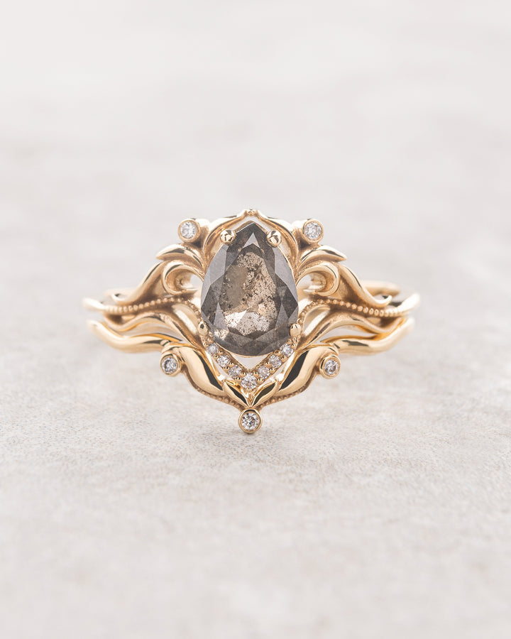 Unique bridal ring set with grey salt & pepper diamond / Lida small