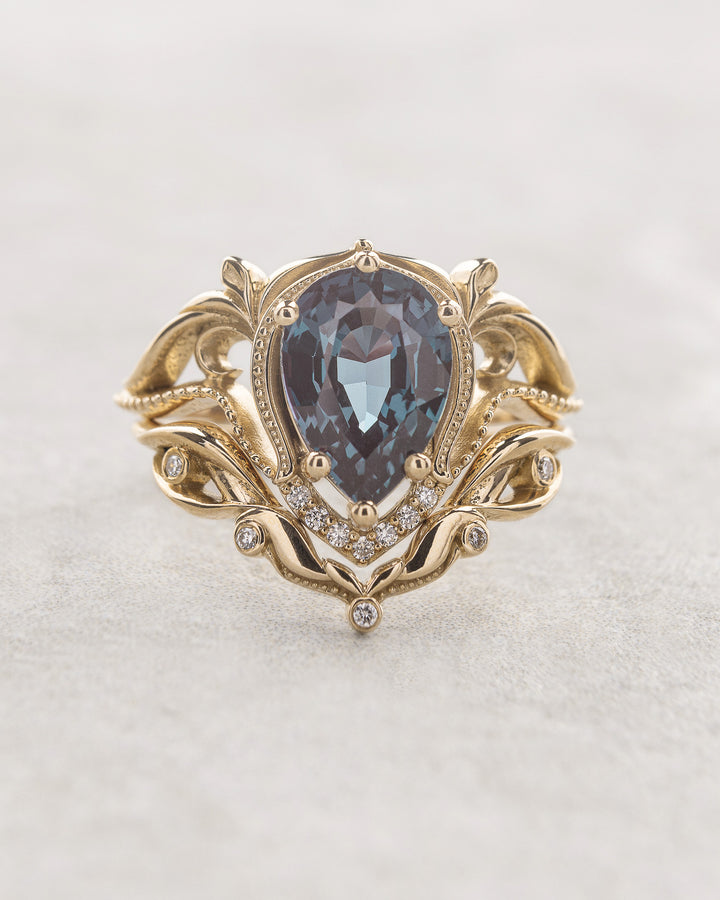 Bridal ring set with big pear cut lab alexandrite / Lida