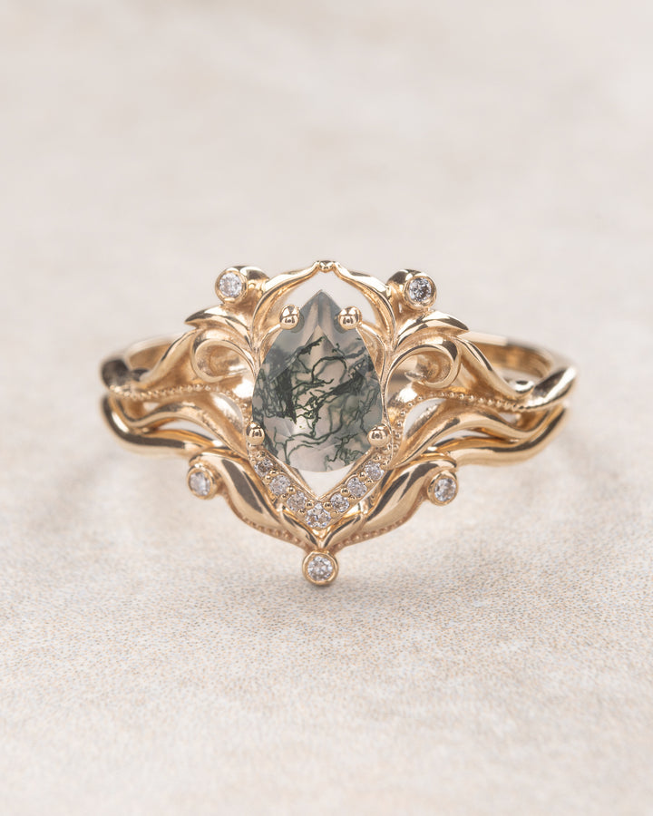 Delicate moss agate bridal ring set, art nouveau inspired engagement ring / Lida small