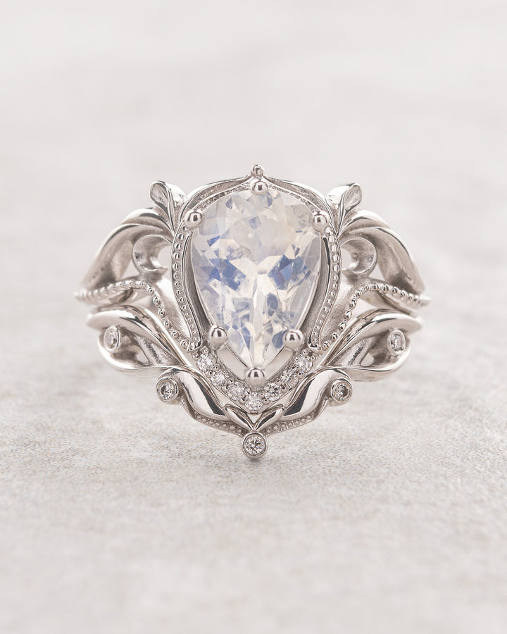 Moonstone engagement ring set, gold statement bridal set with diamonds