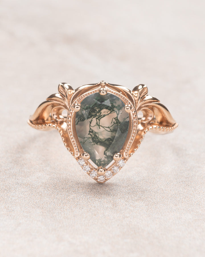 This is an upgraded version of our Lida engagement ring. Art nouveau inspired engagement ring features sophisticated style and timeless look. Big pear cut central gemstone is surrounded by stylised flowers and adorned with sparkling diamonds.