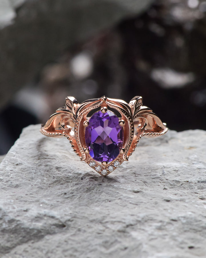 READY TO SHIP: Lida engagement ring with oval cut amethyst in 14K rose gold, RING SIZES: 5.5 - 8.5 US