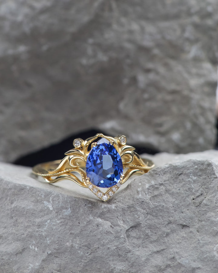 This unique engagement ring features author's design inspired by vintage jewelry. Lida style ring is adorned with pear cut lab grown sapphire. Stylised flowers wraps central gemstone and accent diamonds add charming sparkle.