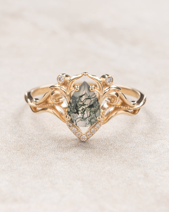 Unique pear moss agate engagement ring, gold ring with diamonds
