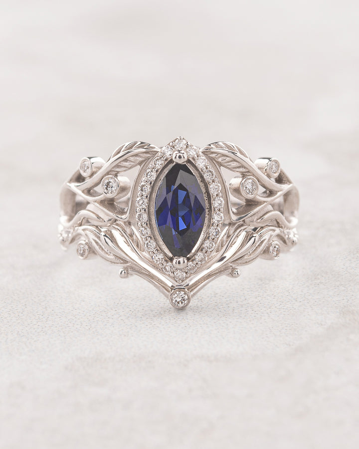 Royal blue art nouveau bridal ring set with lab sapphire and diamond halo / Callisto