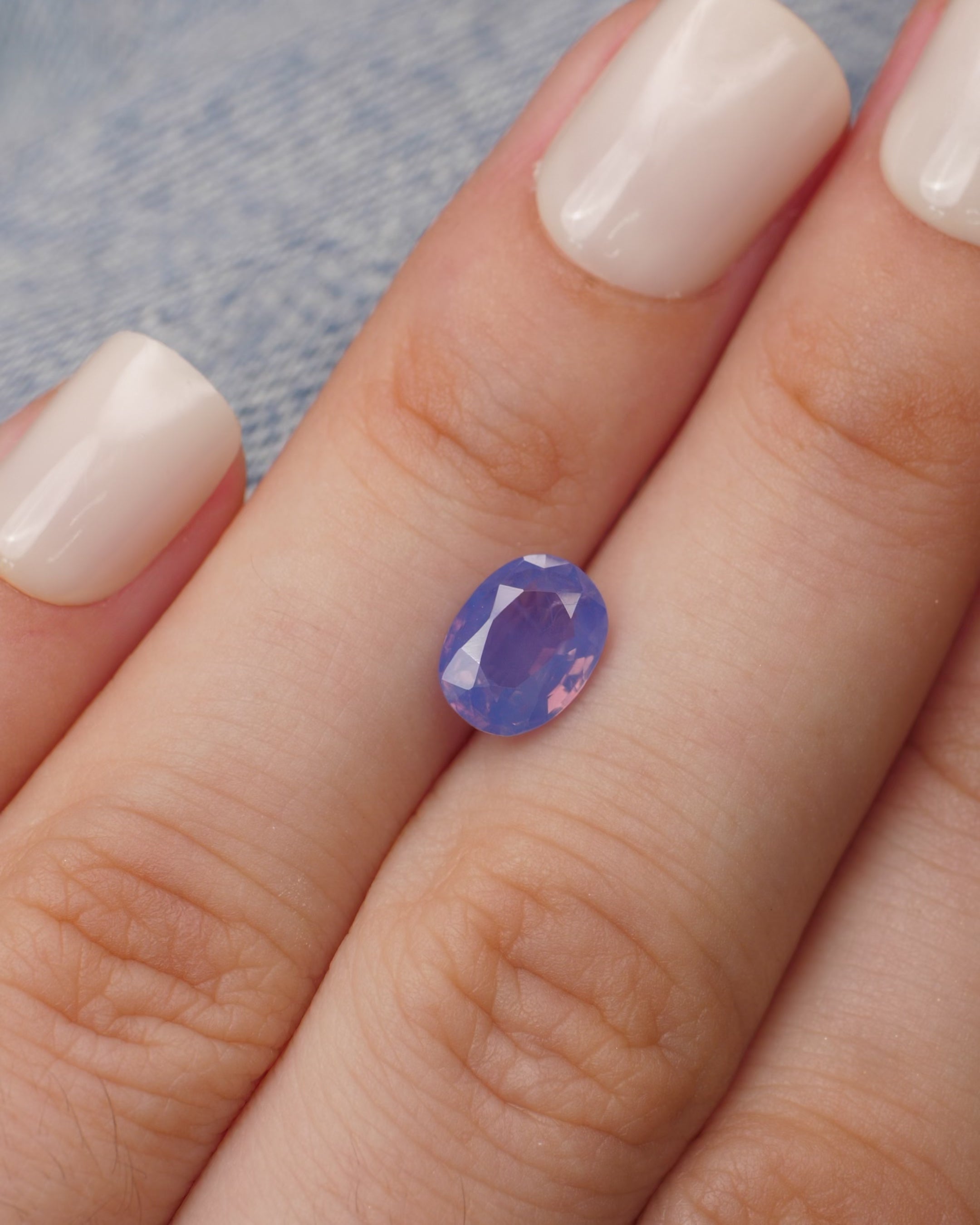 Opalescent sapphire | natural, pinkish purple color, oval-cut, 8x6mm, 1.6ct