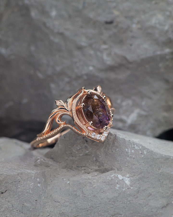 This is an upgraded version of our Lida engagement ring. Art nouveau-inspired engagement ring features a sophisticated style and a timeless look. Big oval-cut central gemstone is surrounded by stylised flowers and adorned with sparkling diamonds.