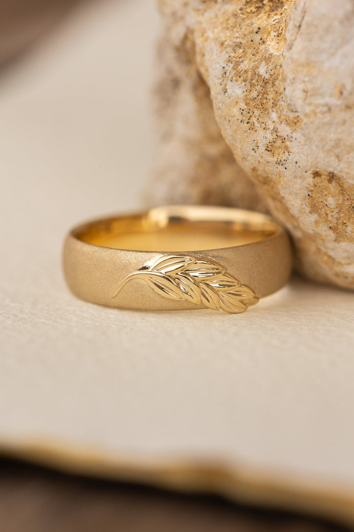 Unconventional wedding band for men features a contrast look of highly polished palm leaf against the satinated gold finish. This ring is designed for those who don't like to wear shiny jewelry, although wish to have an artsy wedding band to be cherished by generations. We tried to keep the minimalistic look, but the same time add a sophisticated detail.