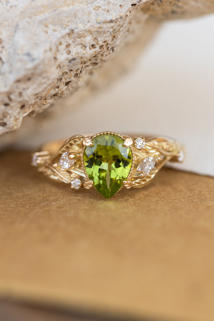 Natural peridot engagement ring, gold vines and leaves ring with accent diamonds