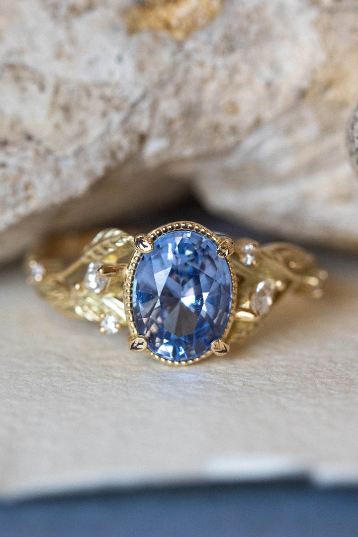 READY TO SHIP: Patricia IGI laboratory certified ring in 14K yellow gold with natural sapphire oval cut 8.6x6.6 mm and accent natural diamonds, AVAILABLE RING SIZES: 5.5 - 8.5 US