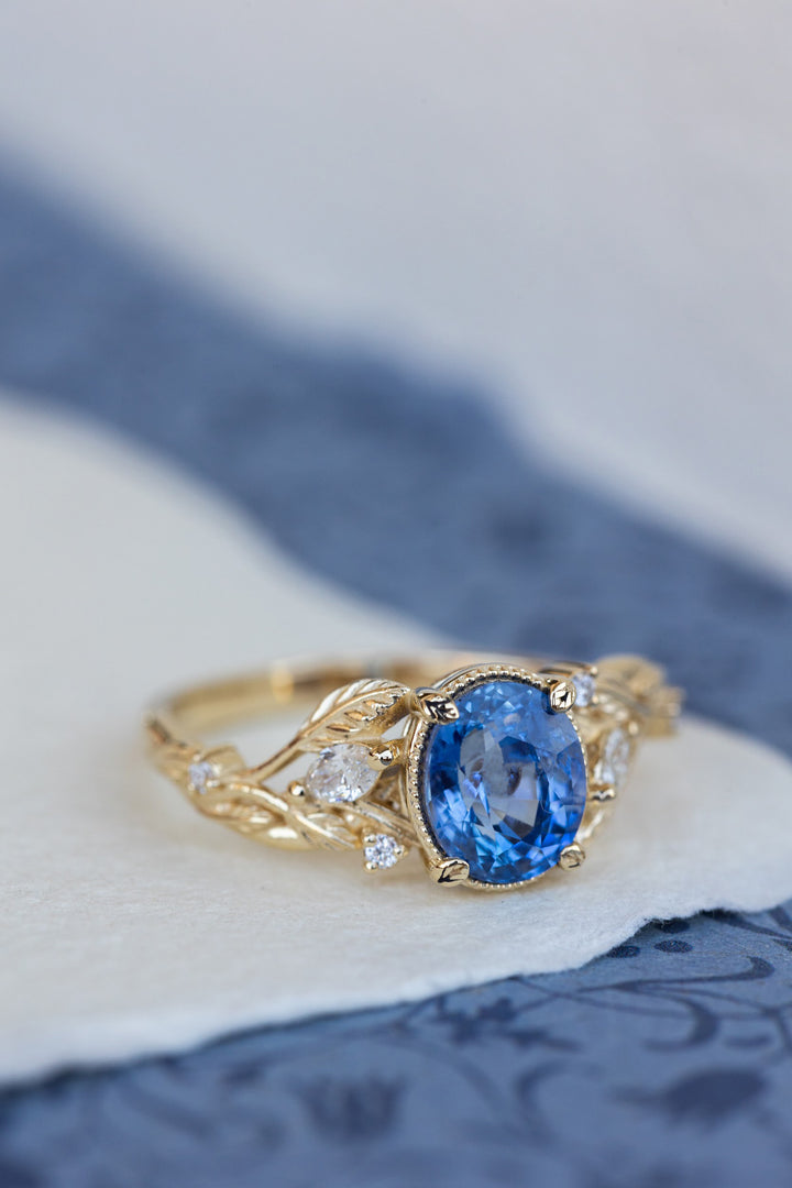 READY TO SHIP: Patricia ring in 14K yellow gold, natural blue sapphire 8x6 mm, accent natural diamonds, AVAILABLE RING SIZES: 5.25 - 8.25 US