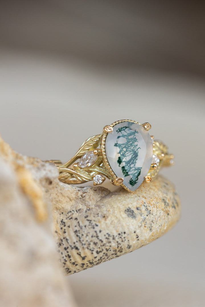READY TO SHIP: Patricia ring in 14K yellow gold, natural moss agate pear cut 10x7 mm, accent moissanites, AVAILABLE RING SIZES: 4.75 - 7.75 US