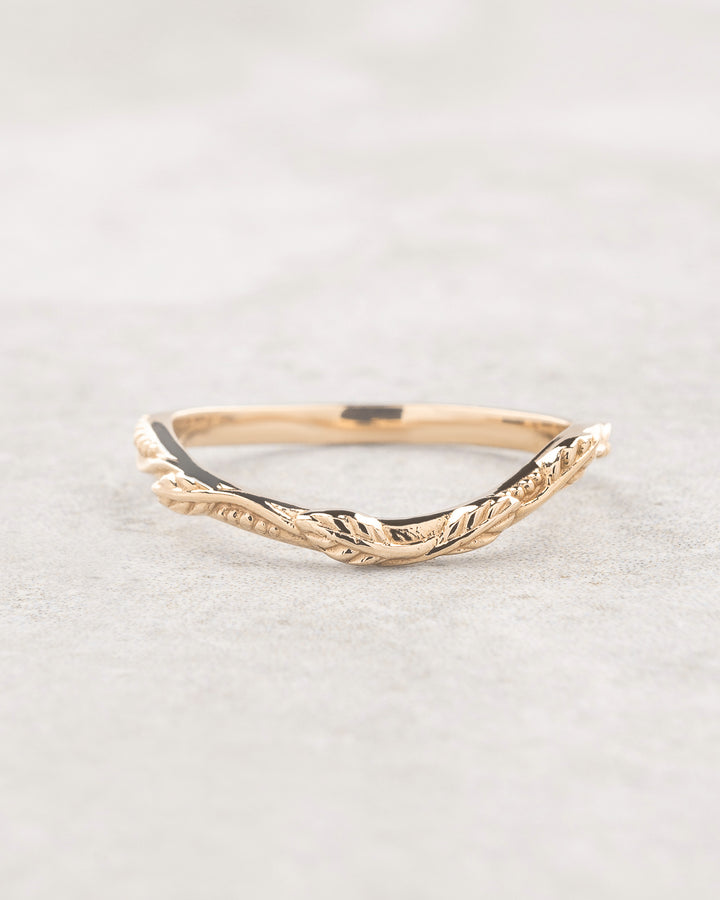 This nature wedding band is a dainty jewelry piece but sturdy enough for everyday wear. It features minimalistic leaf design with naturally curved band.