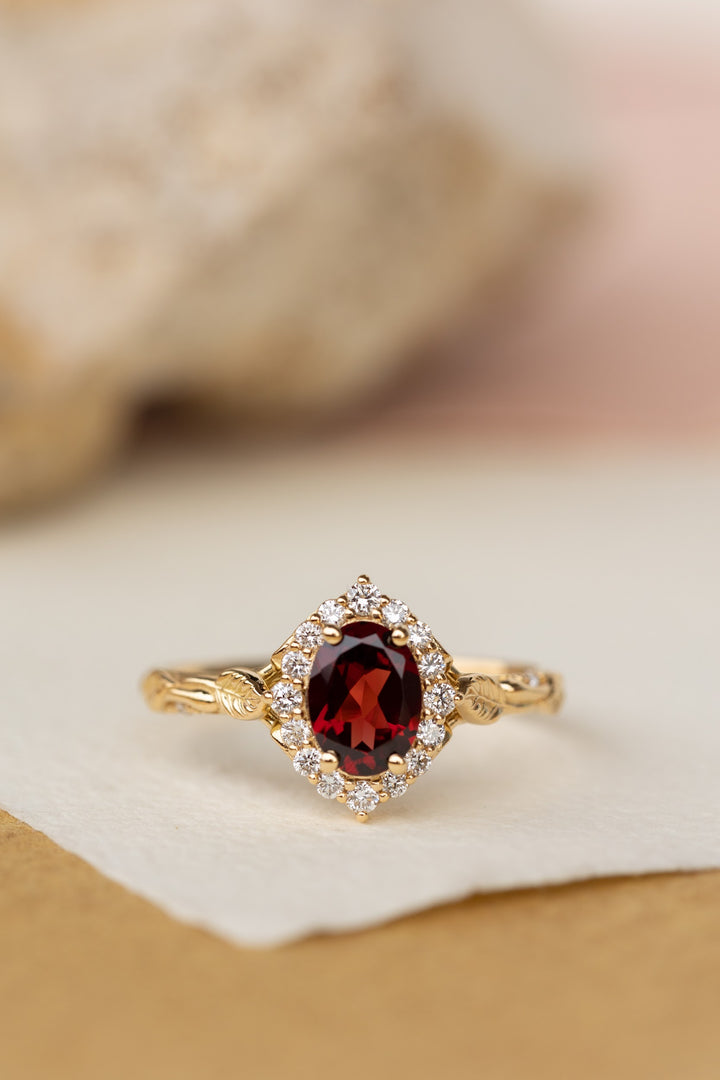 Oval garnet engagement ring with diamond halo, solid gold leaf ring / Florentina