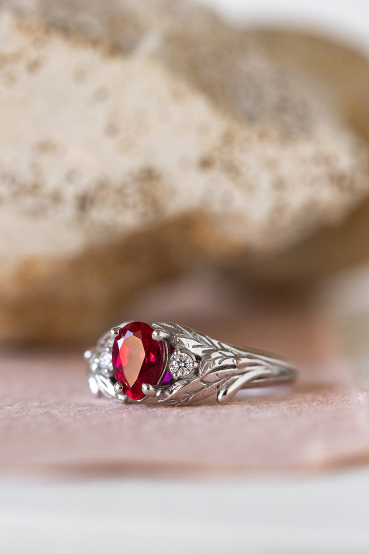 Lab ruby engagement ring, nature inspired ring with accent diamonds