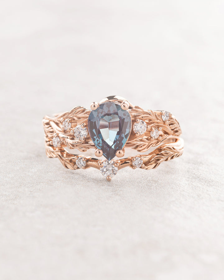 Delicately sculpted, this leaves bridal set would be perfect for alternative engagement ring seekers. You can see Japanese maple leaves wrapping the central gemstone - lab-created alexandrite.