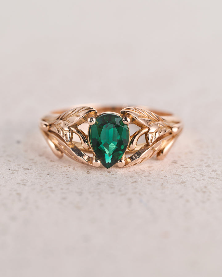 The style of this unique Wisteria engagement ring is timeless and meant to be treasured for generations. Gold leaves naturally wrap pear-cut gemstone. This engagement ring has a comfortable shank and will catch attention with lab emerald's gorgeous, rich colour.