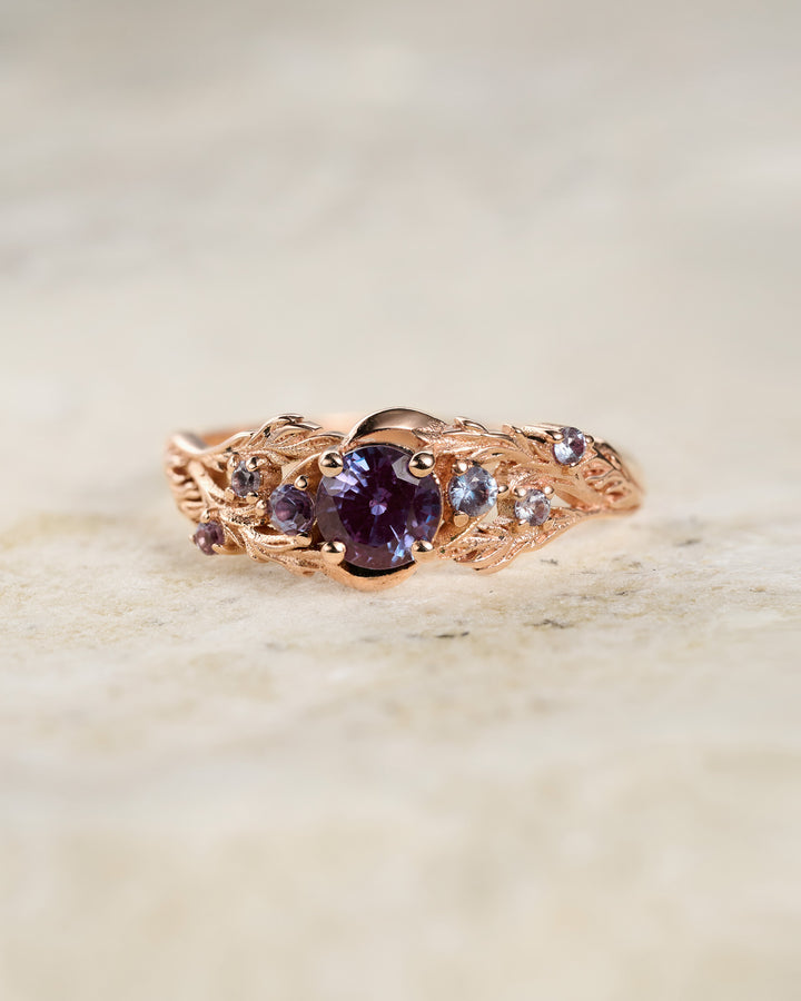 Delicately sculpted, this leaves band would be perfect for alternative engagement ring seekers. You can see Japanese maple leaves wrapping the central gemstone - a lab-created alexandrite. Sparkling accent alexandrites are scattered between gold leaves, reminding of dew in the forest.